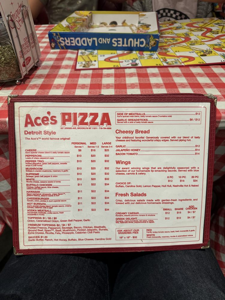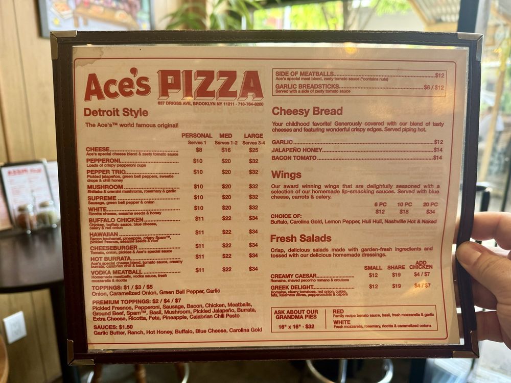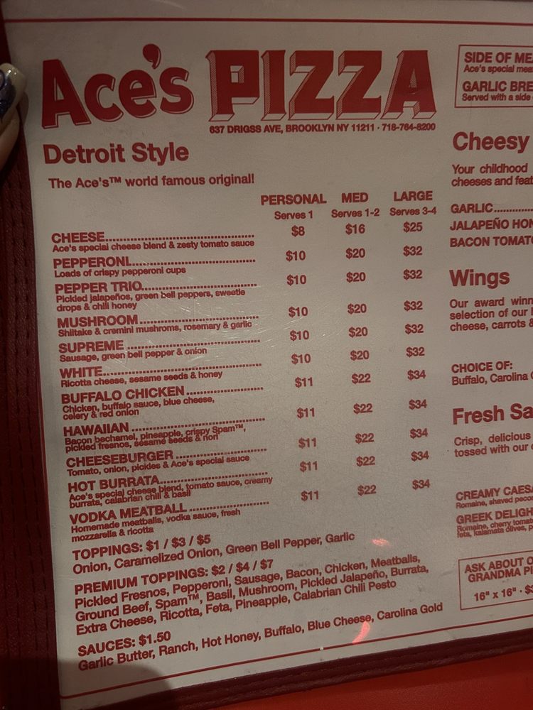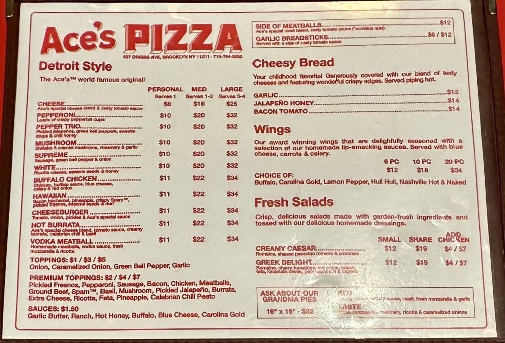 Ace's Pizza, located in Brooklyn, offers a unique dining experience with a variety of Grandma Style pizzas and special truffle-inspired pies. Customers rave about the Hawaiian and white pizzas, highlighting the exceptional taste and fast, friendly service. The pizza is described as square Detroit-style, not too thick or thin, with fresh ingredients that make every bite satisfying. The cozy, old-school atmosphere adds to the charm of the place, making it a must-visit for pizza enthusiasts. Personal favorites include the Cheese and Mushroom medium pizzas, bursting with flavor and cooked to perfection. Ace's commitment to plastic-free packaging and reusable tableware showcases their dedication to sustainability. For a true New York pizza experience, Ace's is the go-to spot in Williamsburg, Brooklyn. Life's too short not to enjoy good pizza here.